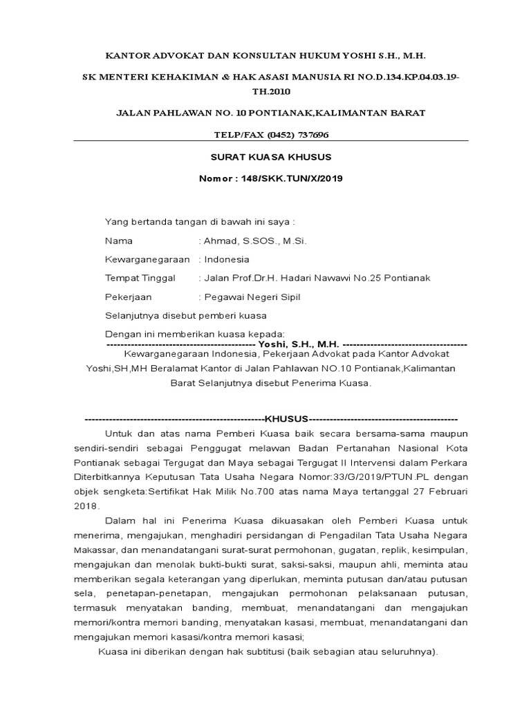 Contoh surat kuasa pengacara untuk kepengurusan hukum contoh surat kuasa pengambilan uang di bank bni, mandiri, bca, bri Sebagai contoh surat kuasa khusus yaitu khusus mengenai hukum bisa dilakukan jika memang ada alasan yang sangat darurat, seperti yang bersangkutan dalam keadaan sakit dan perlu perawatan di rumah sakit. Struktur surat kuasa khusus sama seperti surat kuasa lain hanya saja yang membedakan adalah dalam surat kuasa khusus terdapat tindakan apa saja yang boleh dilakukan penerima kuasa. Surat tersebut berguna untuk membuktikan jika penerima kuasa berhak untuk mengatasnamakan pemberi. Ada kalanya seseorang berhalangan untuk mengambil ijazahnya sendiri begitupun juga dibawah ini, ada contoh dari surat kuasa khusus yang semoga bisa menjadi bahan batubulat no.123 sidoarjo sebagai tergugat mengenai (perkara tertentu) di.